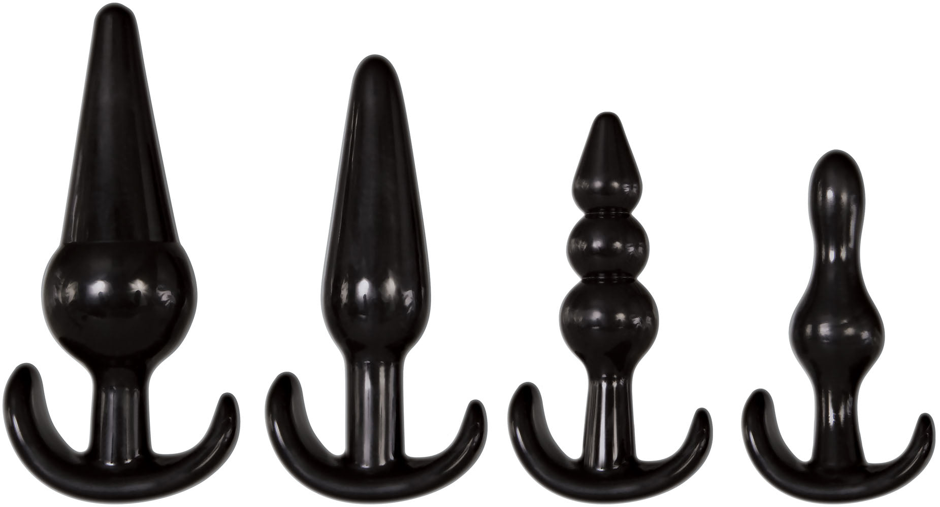 Explore back-door desires with four different shapes and sizes to find out what you like best or experience a different sensation each time! Choose between two smaller plug shapes - a bulbous tip for titillating entry and a beaded shaft for a graduated feel. Then try the medium, slender, rounded cone that's got some girth but slips in with ease, and break out their large cone for that delicious full feeling. Firm yet pliable body-safe TPE rubber has the perfect balance of give and take for ultimate comfort, and the wide crossbow handle ensures your safety and easy navigation!
