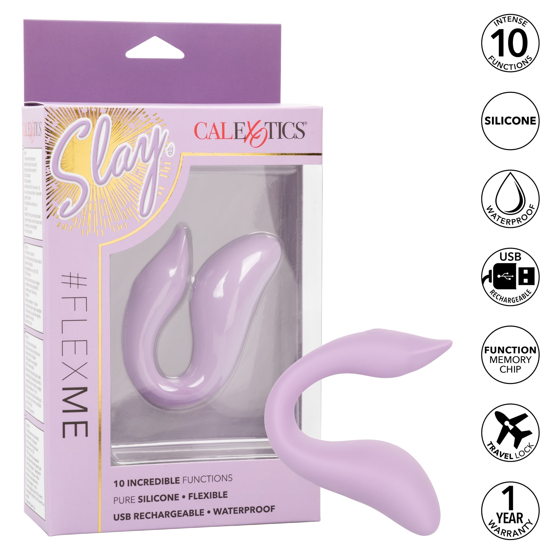 Self care is all about self love and the Slay FlexMe is a self pleasurizer sure to treat you right. The playful massager has a unique flexible design or multi- directional position and 10 functions of rumbling vibrations. Get playful while you flicker through 10 indulgent vibration, pulsation and escalation functions with the easy-touch control button. The uniquely curved teaser is great for exploring sensual sweet spots and the flexible design is ideal for delivering pinpoint stimulation with ease. Effortlessly control pure pleasure with an easy-touch silicone button and hold for 3 seconds to turn on or off. Use the smooth single button control to enjoy up to 60 minutes of vibrating pleasure. Charge up your passion in only 1 hour by plugging the provided USB cable into the self-sealing charging port on the back of the massager. The slim massager discreet 3" (7.5 cm) size makes it the perfect travel companion, letting you embrace radiating pleasure wherever your fantasies take you. Playful and flexible with 100% play area